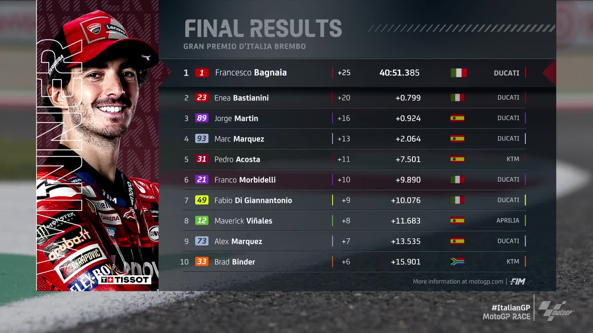 El mazarronero se agarró a ese puesto tras la salida y lo mantuvo hasta el final. Bagnaia dominó desde el inicio y los otros favoritos sólo se adelantaron en las últimas curvas. Acosta es ahora quinto en la general