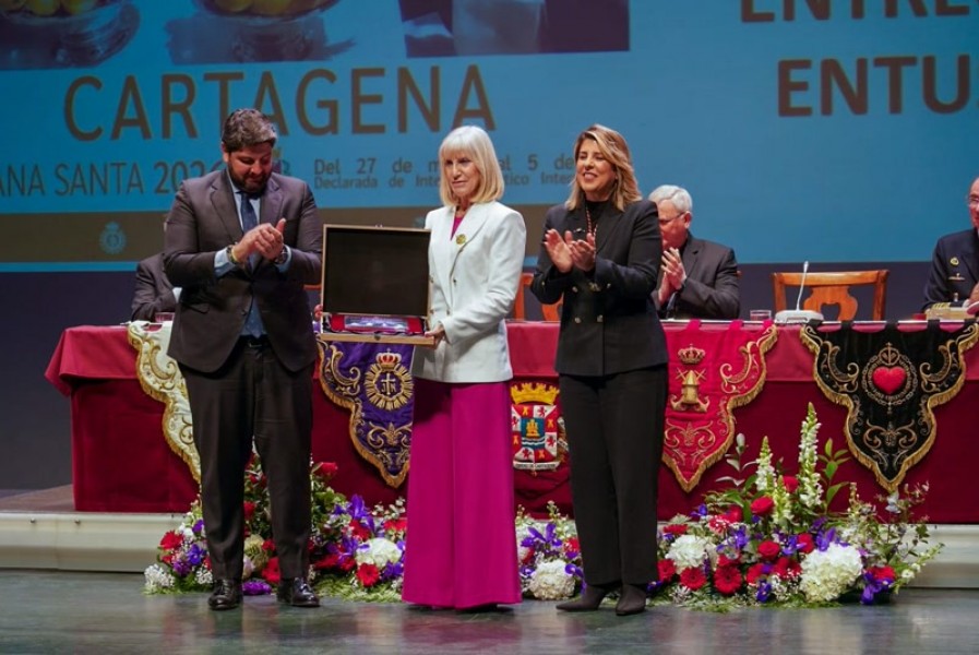 A continuación, Noelia Arroyo entregaba el tradicional broche de oro a la Nazarena Mayor de 2026, doña Toñy Gabarrón Gilabert, que ha recibido también un ramo de flores de su predecesora, María Ángeles Valverde Ruiz. La Semana Santa de Cartagena, declarada de Interés Turístico Internacional, ya está en marcha tras este acto del pregón y la pasada celebración de La Llamada el Miércoles de Ceniza; un acto tradicional en el que se anunció que las procesiones saldrán a la calle del 27 de marzo al 5 de abril.