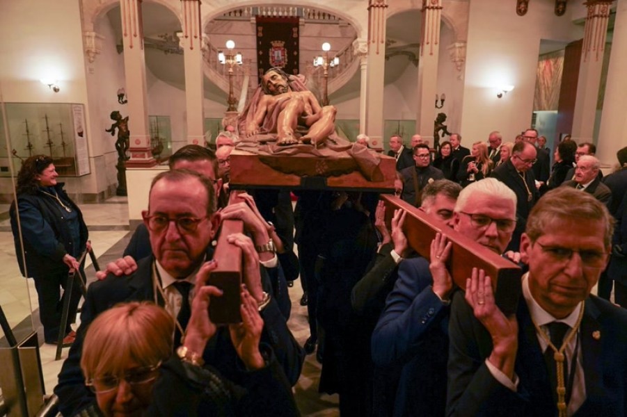 A escasos días del comienzo de la Semana Santa, este viernes tuvo lugar el traslado del Cristo Yacente con un desfile a hombros por las calles del centro de la ciudad, rememorando su llegada hace cien años. Estuvo organizado por la agrupación del Santo Sepulcro y Expolio de Jesús de la Cofradía Marraja, del que la talla de Capuz es titular, dentro de los actos programados para celebrar su centenario.