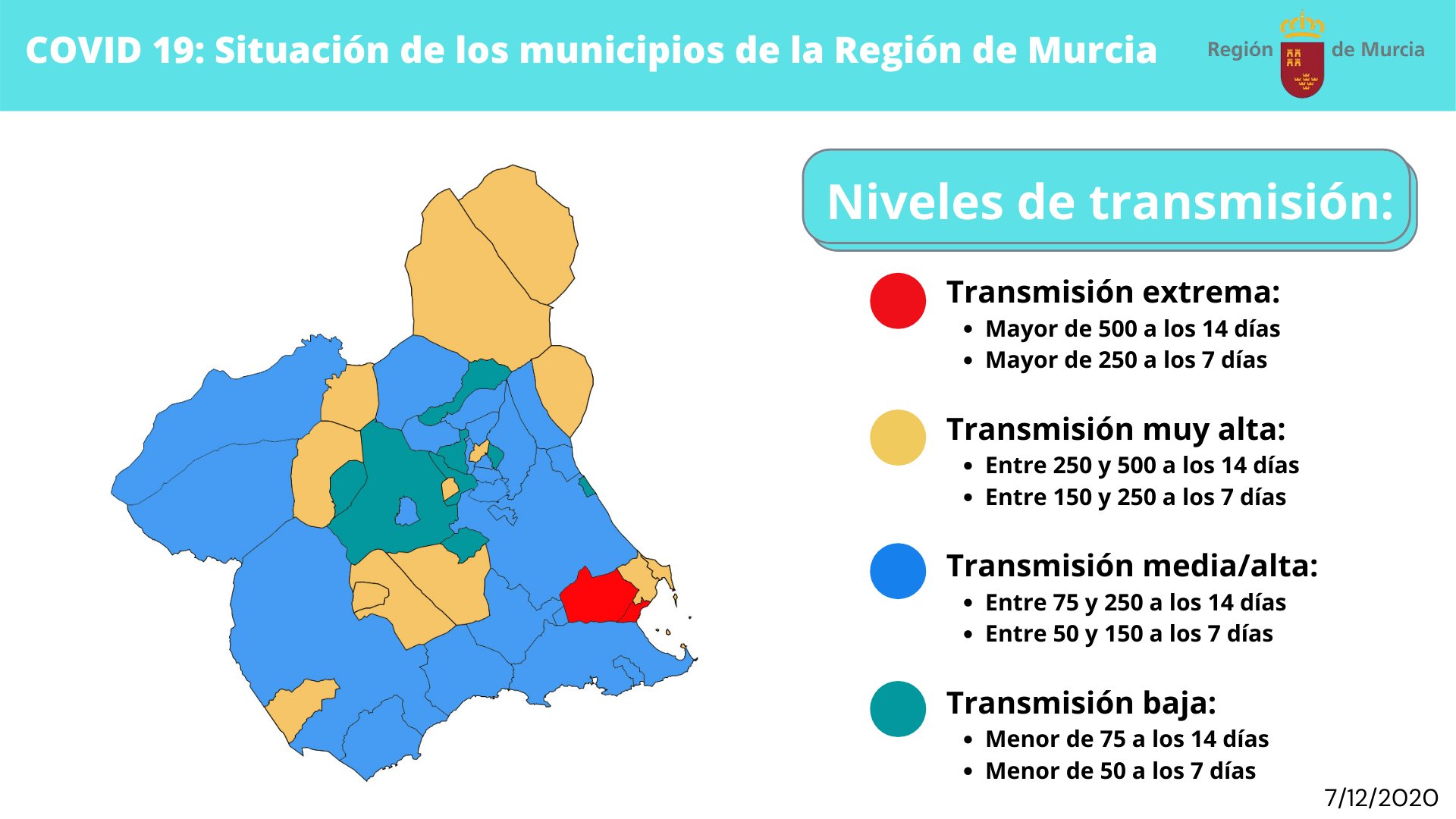 Muy alta, de entre 250 y 500 casos por 100.000 habitantes en los últimos 14 días, la tienen Calasparra, Totana, Puerto Lumbreras, San Javier, Alhama de Murcia, Cehegín, Archena, San Pedro del Pinatar, Yecla y Jumilla, donde los bares mantendrán cerradas las barras y podrán abrir el interior al 30 % de aforo.