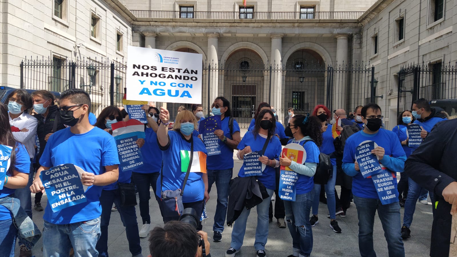 En Nuevos Ministerios se ha congregado la Junta de Gobierno del Sindicato y los miembros de la plataforma del Círculo por el Agua a la espera de que la ministra les reciba, aunque Teresa Ribera se encuentra en Toledo en un acto en el que participa Pedro Sánchez sobre hidrógeno verde en Europa. Los convocantes han lamentado que finalmente la ministra no les haya recibido.