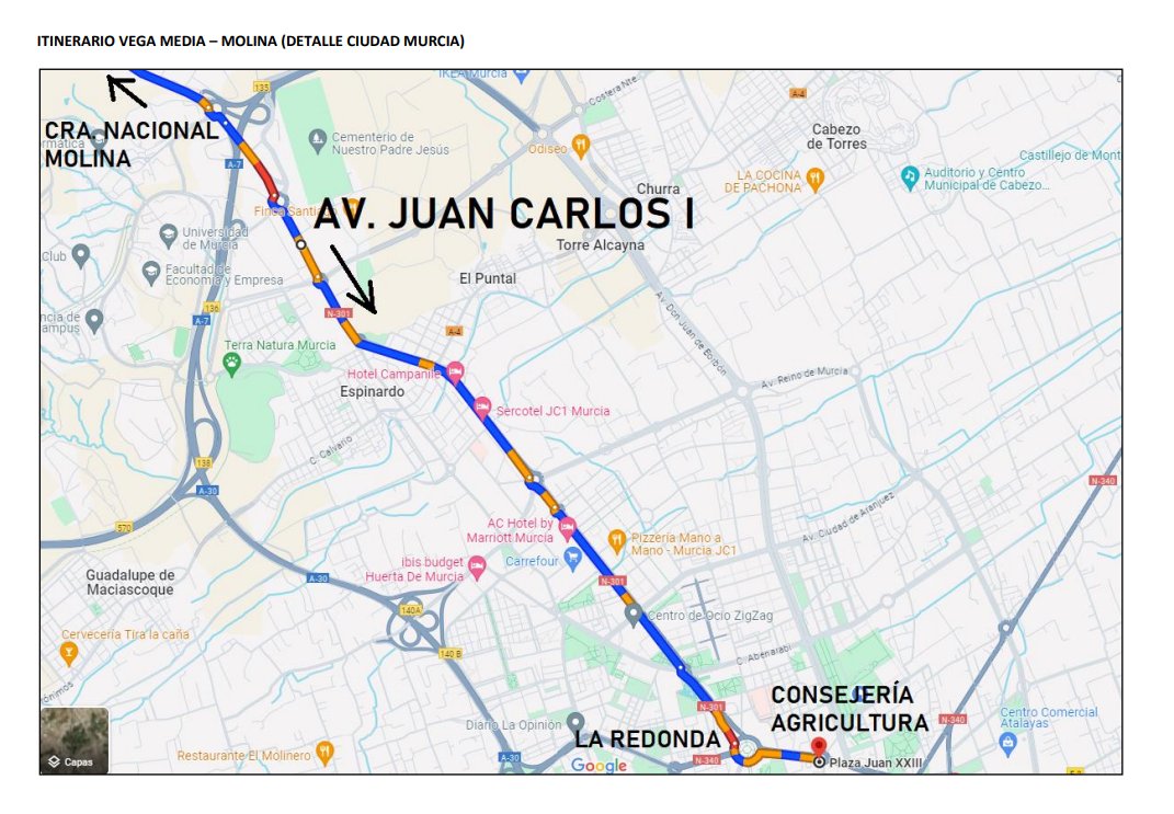- Recorrido columna: Polígono Industrial Base 2000 Lorquí – Carretera Nacional 301- Avenida de Juan Carlos I (Murcia) – Plaza Circular – Plaza Juan XXIII - Plaza Circular, y retorno.