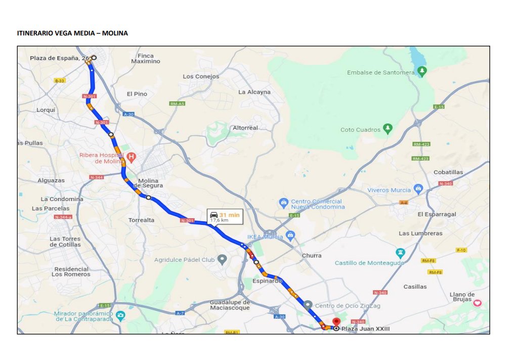 La zona de la Vega Media tiene su punto de encuentro en el Polígono Industrial Base 2000. Recorrerá la nacional 301 hasta Juan Carlos I en Murcia, y llegará a la Plaza Circular pasando por Juan XXIII.