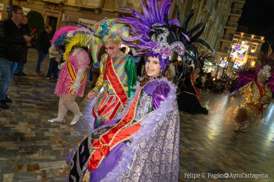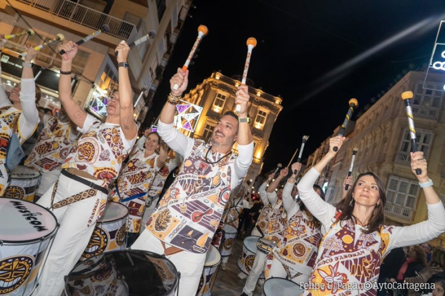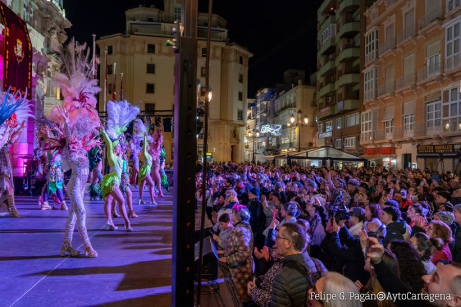 Por su parte, Pignatelli, empleando un simil marinero elogiaba al Carnaval, "cual galeón de música y color, que leva anclas, iza sus velas y surca un mar de música estos días de las fiestas", mientras que un gran Castillo de Fuegos Artificiales cerraba los actos que dan la bienvenida al Carnaval de Cartagena 2026.