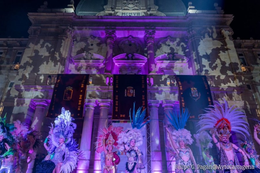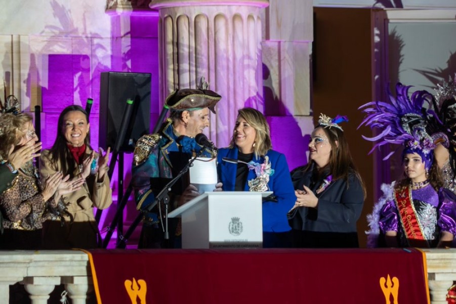 El balcón principal del Palacio Consistorial ha vuelto ha vuelto a ser escenario del gran inicio del Carnaval de Cartagena, fiesta que llena de alegría, música, bailes y color la ciudad, y que este año, además, ha tenido una gran repercusión a nivel nacional tras desfilar, el pasado mes de enero y con motivo de la celebración de FITUR, por las calles más céntricas de Madrid.